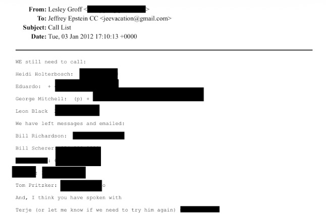 A January 2012 email from Epstein to his assistant mentioned “george mitchell, bill richardson, eduardo,” with staff follow-up noting: “WE still need to call: George Mitchell.”