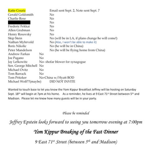 Mitchell was invited to an exclusive Yom Kippur dinner at Epstein’s Manhattan mansion on Sept. 18, 2010, but he did not attend.