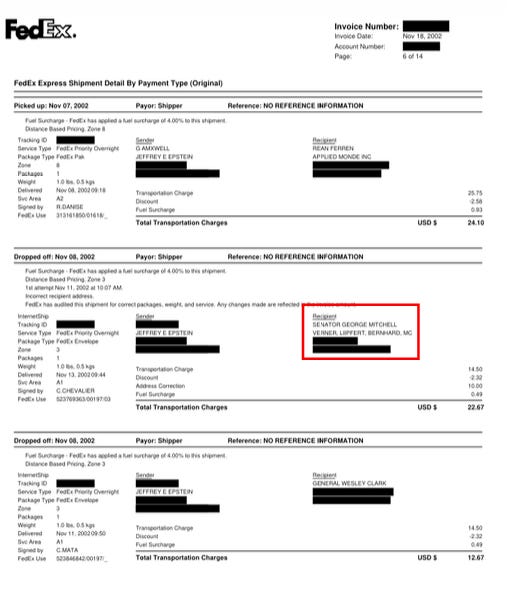 That’s when FedEx shipping records show a package delivered from “JEFFREY E EPSTEIN” to “SENATOR GEORGE MITCHELL” at his law firm, “VERNER, LIIPFERT, BERMIARD, MC,” on Nov. 13, 2002.