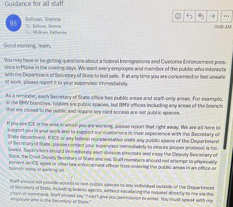 On the same day, Bellows instructed government employees to alert her, personally, if they see immigration agents or suspected immigration agents “in the area” of government buildings, according to an email obtained by The Robinson Report.